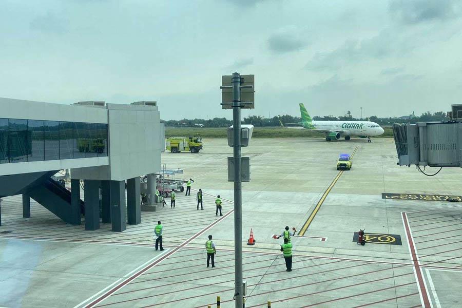 Pesawat Citilink dengan nomor penerbangan QG 752 yang terbang dari Bandara Internasional Soekarno-Hatta mendarat mulus di landasan pacu Dhoho. Tradisi water salute yang dilakukan oleh petugas pemadam kebakaran bandara menyemprotkan air membentuk lengkungan di atas pesawat sebagai bentuk penghormatan atas pendaratan perdana di bandara baru tersebut.